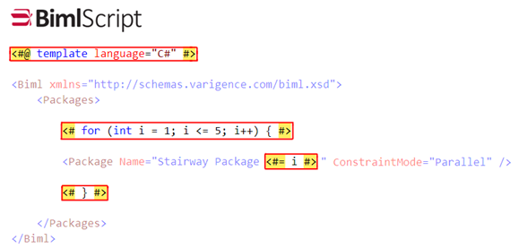 One of the most common tasks for a standard Control Block is to iterate over a set of objects and replace text in the Biml file with metadata from the looping method. A very basic example of this concept is to create a loop with the For loop statement that will iterate from 1 to 4 and create 4 packages.