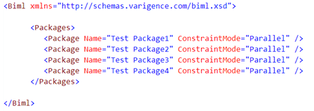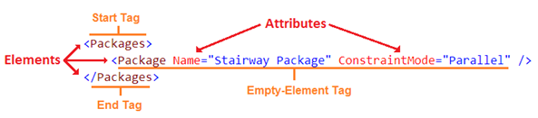 Let’s use an example to better define the above key terminology. In Figure 1 below, <Packages> and <Package> are XML Elements. Name and ConstraintMode (in red) are XML Attributes of the <Package> Element.