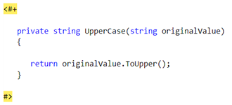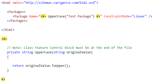 A very contrived example might be to include a function that creates an upper case string. This function could easily be achieved by using the ToUpper() function within your C# Biml Script and is only being used to demonstrate the use of a Class Feature Control Block.