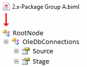Figure 20 – 2.x-Package Group A.biml file and the RootNode object prior to start of Tier 1