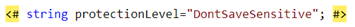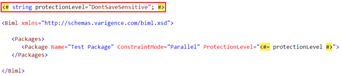 An example of an Include Directive that enables a variable to be referenced from another file is as follows. In this example a file is created i-Parameters.biml (Figure 7) that contains a string variable for the package protection level and is then referenced with an Include Directive to be used within the Main.biml file (Figure 8).