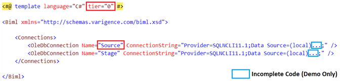 Figure 4 – Highlighted Biml Script sections within a Biml file