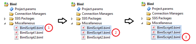 To use File Selection to dictate compile order, use the following process. In this example we will select the three Biml files to compile them in the subsequent order: BimlScript0, BimlScript1, and BimlScript2.