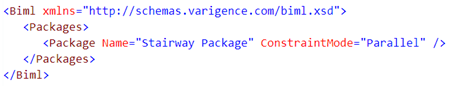 The following example is a Biml text block that gets sent directly to the Biml engine. The Biml engine then complies the XML and produces an Integration Services package named Stairway Package.