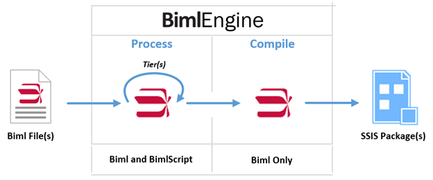 Step 2 [Biml and BimlScript] – The Biml Engine loads all of the selected files into memory to start processing. Processing starts with Tier 0 (if available) before moving to Tier 1, Tier 2, etc. This continues until all of the tiers are processed in order. If you need a refresher on Tiers, Biml and BimlScript, see the previous Stairway to Biml article: Level 5 - Biml Language Elements.