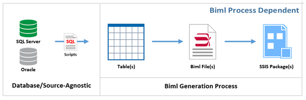 The recommend method to load Biml metadata is outside of the Biml generation process as depicted in the Figure 4 below. Creating scripts that load source metadata outside of the Biml generation process enables source specific code to stay outside of the Biml files. Changing a data source would only require new SQL scripts to load the metadata tables. This updated metadata would not require any code change within the Biml Process Dependent area because the metadata table structure did not change.