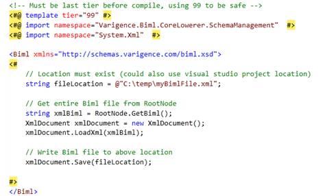 This enables a more modular approach and is similar to the behavior that is used in Mist / BimlStudio. These files can be saved in the miscellaneous folder along with the other Biml files and referenced from any other Biml file within the project using the RootNode function. For more information on RootNode, see the previous Stairway to Biml article: Level 5 - Biml Language Elements.