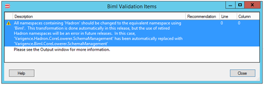 Note: BIDS Helper Version 1.7.0 was released on Mar 17, 2015 and introduced some code changes that will give your existing Biml code warnings. This feature did not exist prior to this release. The most notable change was the organization within the Varigence namespace. This update removed the Hadron namespace and replaced it with the Biml namespace. Compiling code after this release will result in warnings that did not exist prior to the release, as shown below in Figure 1.