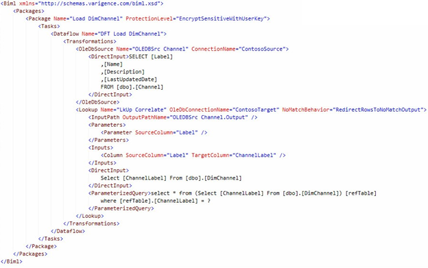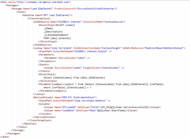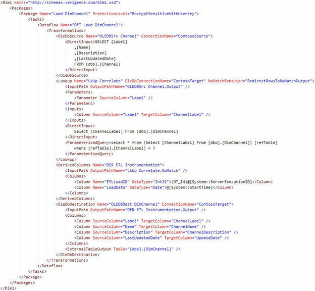 In this section we read metadata from the Biml Relational Hierarchy to build an SSIS Package that loads new rows into the ContosoRetailDW.dbo.DimChannel table. In the end, we built a single SSIS Package. Only one.
