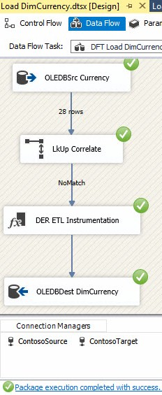 As before, let’s open the Load DimCurrency.dtsx SSIS Package and execute it in the SSDT debugger. It should succeed as shown in Figure 25: