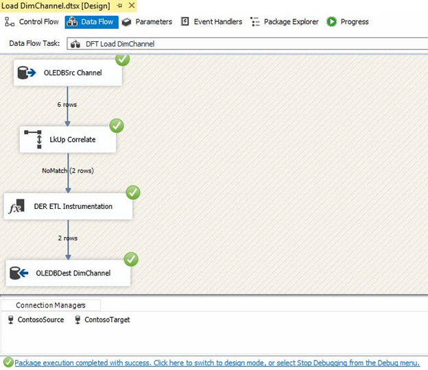 If you open the Load DimChannel.dtsx SSIS Package, view the Data Flow Task, and execute the SSIS Package in the debugger. The package should execute and succeed as shown in Figure 22: