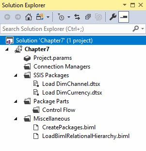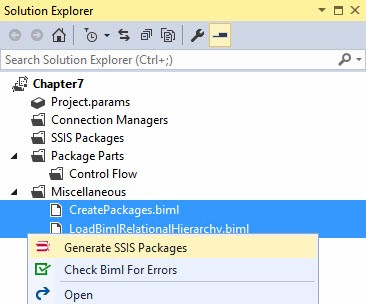 Save the Chapter7 project and then multi-select the CreatePackages.biml and LoadBimlRelationalHierarchy.biml files in Solution Explorer. Right-click the selected files and click Generate SSIS Packages as shown in Figure 20: