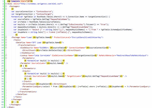 Figure 1. Viewing CreatePackages.biml with Target Table BimlScript