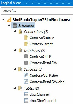 Executing LoadBimlRelationalHierarchy.biml populates the Biml Relational Hierarchy. We can see the results in Logical View, as shown in Figure 8: