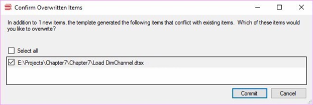 If all goes as planned, you will see a dialog that warns you the code is attempting to overwrite the Load DimChannel.dtsx package, as shown in Figure 23: