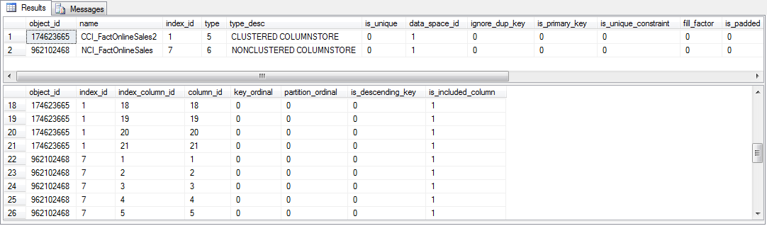 You can find information about indexes in two generic catalog views: sys.indexes and sys.index_columns. The code in listing 4-2 queries these two views for just the two existing columnstore indexes, and figure 4-1 shows partial results on my system. The full output of the second query is 42 rows: 2 tables, 21 columns in each, and all of them are included in the indexes.