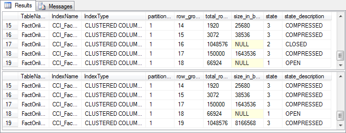 After waiting five minutes, the DMV query is repeated. Now the closed rowgroup has gone, and is replaced by a new rowgroup with state 3 (COMPRESSED). This is caused by the tuple mover – a background process that wakes up every five minutes, checks to see if there are any rowgroups with state 2, and if there are, converts the data in these rowgroups to columnstore format.