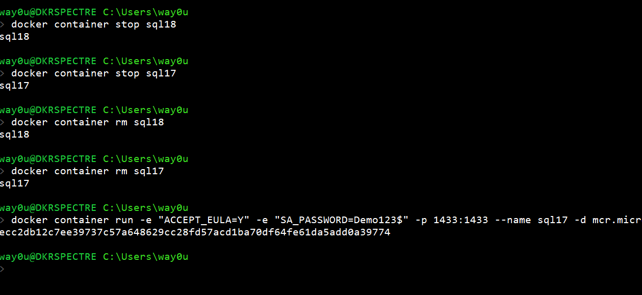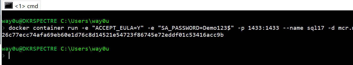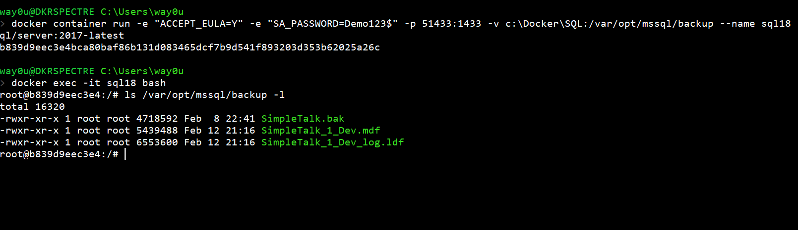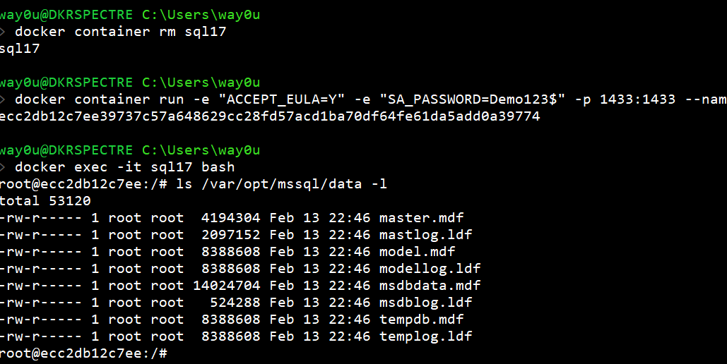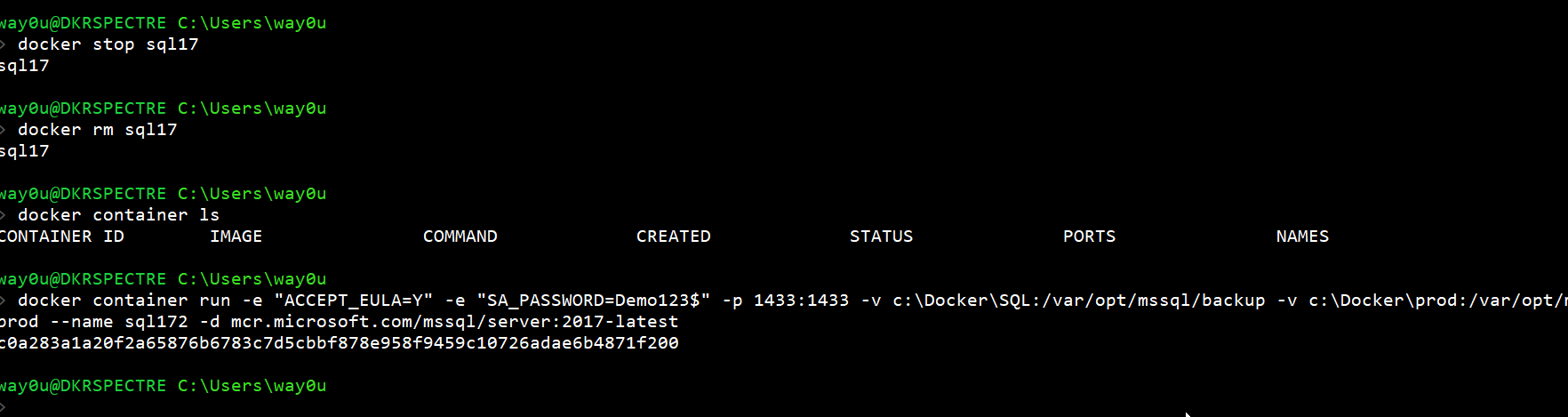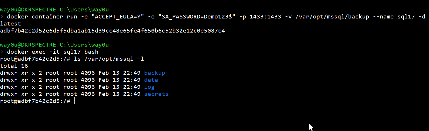 docker container run -e "ACCEPT_EULA=Y" -e "SA_PASSWORD=Demo123$" -p 1433:1433 -v c:\Docker\SQL:/var/opt/mssql/backup -v c:\Docker\prod:/var/opt/mssql/data/prod --name sql17 -d mcr.microsoft.com/mssql/server:2017-latest