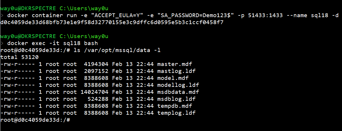Let's now start a second container and call this SQL18. We won't create a database, but just connect to the container and check the filesystem.