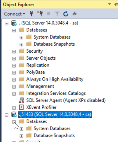 However, we don't see a database in SSMS. This is a separate instance, in a separate container.