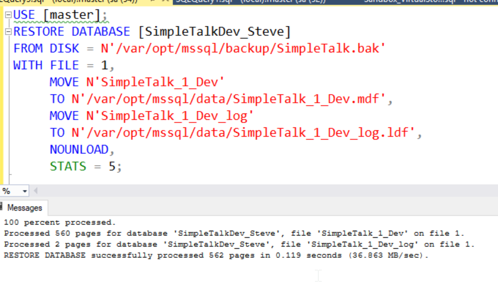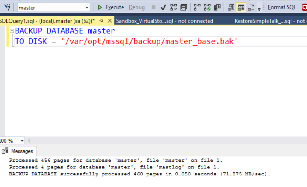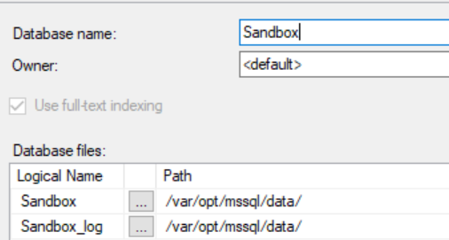 I can then connect to this container with SSMS and create a database. This will create the database mdf/ldf files in /var/opt/mssql/data. Let's see this below: