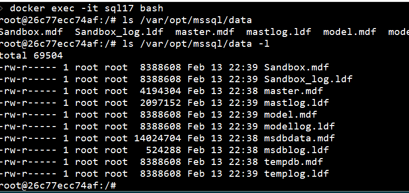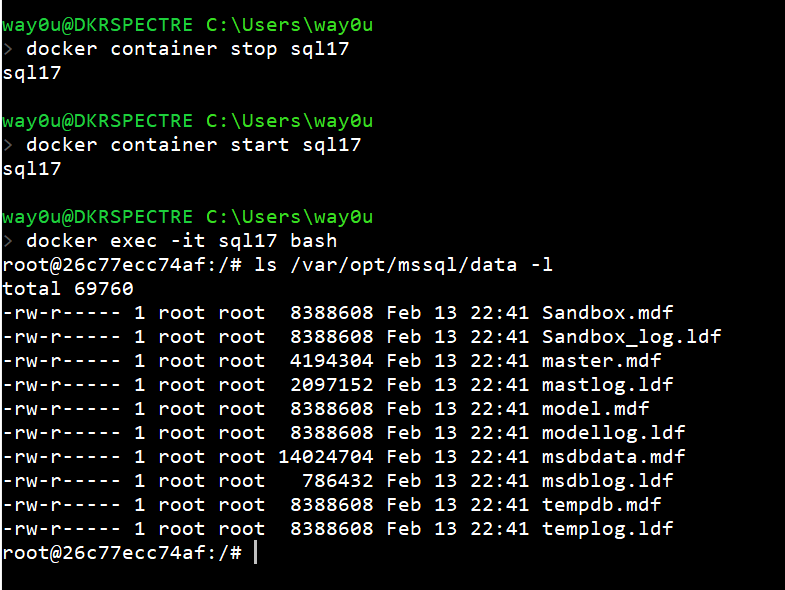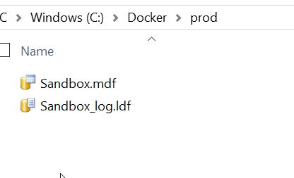 If I stop the container, the new files (sandbox.mdf and sandbox.ldf) still exist. I can start the container and see this is the case.