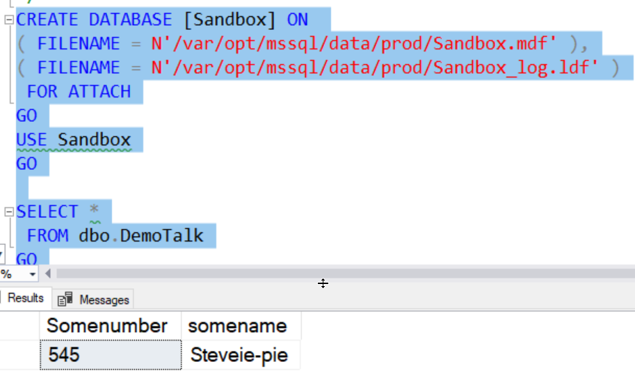 Now we'll run the attach and select script. Once we do that, we have the same data that the other container in this database.