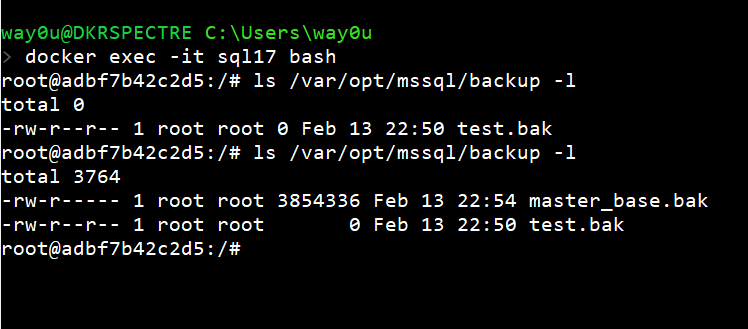 I use the docker exec command to connect to the container and run the bash shell to check the files. As we can see, there are database files here.