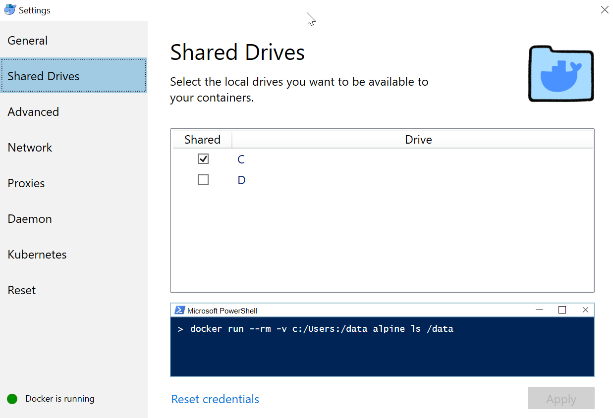 On Windows, we need to let Docker know which drives will be potentially shared. If you access the settings of your Docker runtime client, you will see a Shared Drives section. Check the drive(s) that you wish to share with containers.