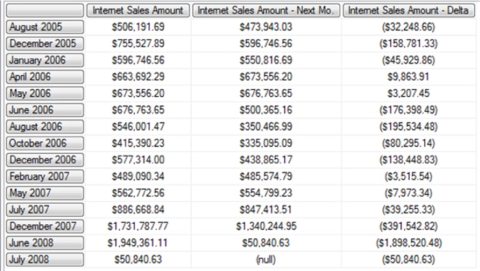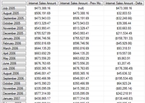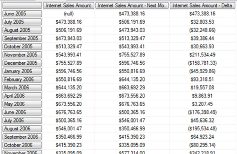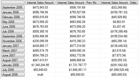 Illustration 07: Example Result Dataset Returned via the Combination of .CurrentMember and .PrevMember (Partial View)