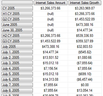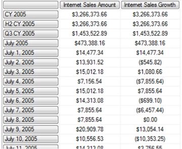In the example above, the WITH clause again contains the definition of the calculated member Internet Sales Growth. We employ a combination of the .CurrentMember and .PrevMember functions to generate the respective “current period” at its given point within the Date.Calendar dimension hierarchy, as well as the corresponding “previous period.” We note that, unsurprisingly, the calculated measure, Internet Sales Growth, has the same value as the base measure, Internet Sales Amount, in each of the members CY 2005, H2 CY 2005, Q3 CY 2005, July 2005 and July 1, 2005 in the Date.Calendar hierarchy levels. As we learned earlier, sales began on July 1, 2005, and, so, the values at each of these levels reflect the full delta over the (empty) previous periods.