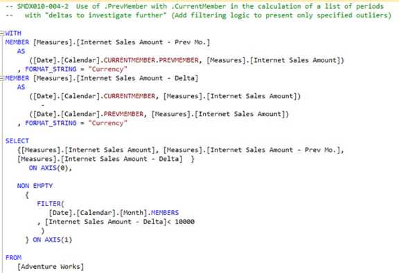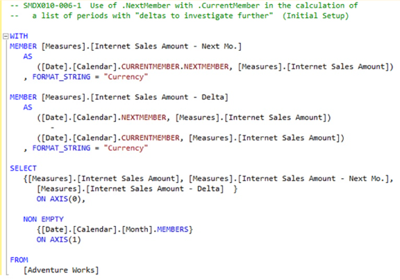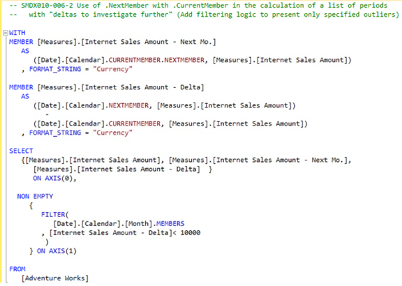 -- SMDX010-006-2 Use of .NextMember with .CurrentMember in the calculation of a list --- of periods with "deltas to investigate further" (Add filtering logic to present -- only specified outliers)