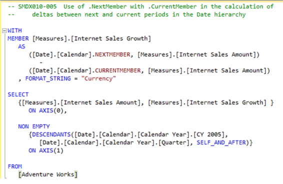 The example above accomplishes very similar results to those of the first practice example we undertook for the .PrevMember function earlier. The WITH section contains the definition of the calculated member Internet Sales Growth, within which we employ a combination of the .NextMember and .CurrentMember functions to generate the respective “current period” at its given point within the Date dimension hierarchy, as well as the corresponding “next period.”