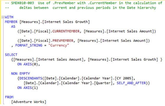 In the example above, the WITH section again contains the definition of the calculated member Gross Profit Margin. We note, as well, that the .CurrentMember function is employed within the definition of the calculated member – we are simply specifying the current member of the Date dimension (Calendar hierarchy), which turns out to be the calendar quarter specified in the respective row of the Rows axis. Indeed, we note that we get the same result set if we omit the [Date].[Calendar].CurrentMember specification from the AS portion of the above example, as we did in the introductory example just above, where we are defining the calculated member. This is because .CurrentMember is the default for any dimensions that we do not explicitly specify; in effect, all unspecified dimensions in the example would also be defaulted to “current member.” We have, therefore, really been using .CurrentMember all along, perhaps without even knowing it!