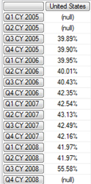 As we can see above, the WITH clause contains the definition of the calculated member Gross Profit Margin. The newly created Gross Profit Margin is a member of the Measures dimension, and is composed of the difference between Internet Sales Amount and Internet Total Product Cost, divided by the Internet Sales Amount. We intersect the United States country member of the Customer.Customer Geography hierarchy with the Calendar Quarters of the Date.Calendar hierarchy for the purposes of our query. The returned dataset, therefore, comprises the percentage of total sales generated by the total Internet Sales Amounts less the Total Product Cost for products, for each of the respective calendar quarters stored within the Adventure Works sample cube.