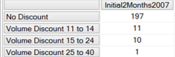 ([Measures].[Reseller Order Count])Once Analysis Services returns the resulting data set, we can scroll over to the columns representing January and February of 2007, and visually verify that the values of the two, added together, give us the values delivered by our new Initial2Months2007 calculation, as shown.