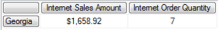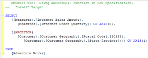 [Adventure Works]Here, as in the previous example, we’re specifying two measures, Internet Sales Amount and Internet Order Quantity, in our columns, and don’t, once again, require the slicer specification (WHERE). We are also using the Ancestor() function with the level target of State-Province in the Customer Geography hierarchy of the Customer dimension. Because we specify the Postal Code level, with 30253 as the source member, we would expect to see the U.S. state of Georgia in the result dataset. Again, our expectations will prove to be correct.