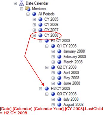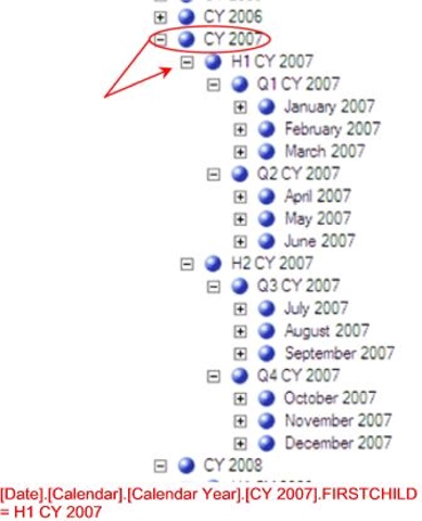 Illustration 8: [Date].[Calendar].[Calendar Year].[CY 2007].FIRSTCHILD is H1 CY 2007