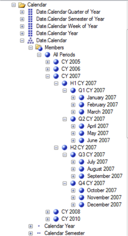 A look at the Date hierarchy for the source member (CY 2007) within the .FirstChild function above will make the illustration more meaningful. In Illustration 10 below, we see that H1 CY 2007 is a member of the Semesters / Half-Year sublevel of the Calendar Year level, within the Date.Calendar dimension hierarchy. The order of the members within the database determines the status of H1 CY 2007 as “first:” H1 CY 2007 is the child of the CY level 2007, and as it is “first in line,” it is returned via the .FirstChild function.
