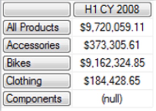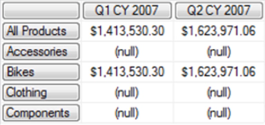 From the use of .Children we will enumerate the quarters contained within semester H1 CY 2007, which we saw earlier was the first child of member CY 2008 of the Date dimension, Calendar hierarchy. Our objective will be to create a column for each quarter in semester H1 CY 2008 and a row for each Product Category.
