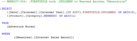 As our straightforward example makes obvious, the “first child” of level member [Date].[Calendar].[Calendar Year].[CY 2008] is H1 CY 2008. (As to the use of the .Members function, recall from Level 5: Members, and an Introduction to the MDX Members Functions that the .Members operator gives us the members of the dimension / dimension hierarchy.)