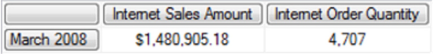 [Adventure Works]Here, we’re specifying two measures, Internet Sales Amount and Internet Order Quantity in our columns, and don’t require the slicer specification (WHERE). We are also using the Ancestor() function with the distance target of Month in the Calendar hierarchy of the Date dimension. Because we specify the Date level, with March 14, 2008 as the source member, we would expect to see the month of March (for calendar year 2008) in the result dataset. We will not be disappointed in our expectations.
