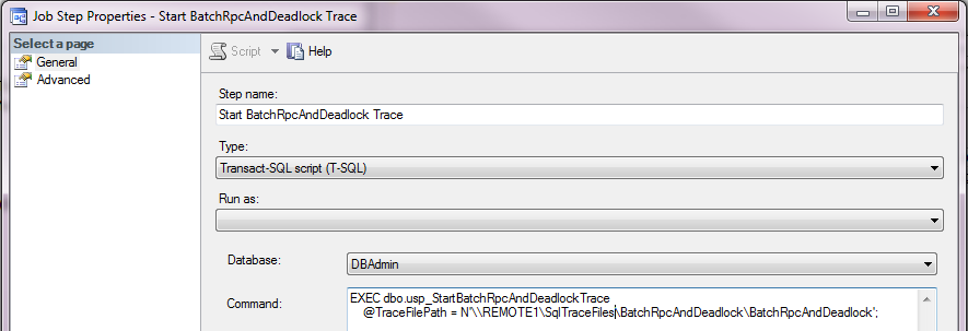 CREATE DATABASE DBAdmin; GO USE DBAdmin; GO CREATE PROCEDURE dbo.usp_StartBatchRpcAndDeadlockTrace @TraceFilePath nvarchar(245) AS DECLARE @rc int ,@TraceID int ,@maxfilesize bigint; SET @maxfilesize = 100; EXEC @rc = dbo.usp_DeleteTraceByTraceFilePath @TraceFilePath; EXEC @rc = sp_trace_create @trace_id = @TraceID output , @options = 2 --rollover , @tracefile = @TraceFilePath , @maxfilesize = @maxfilesize , @stoptime = NULL , @filecount = 10; IF (@rc != 0) GOTO Error; -- Set the events declare @on bit; set @on = 1; exec sp_trace_setevent @TraceID, 148, 11, @on; exec sp_trace_setevent @TraceID, 148, 12, @on; exec sp_trace_setevent @TraceID, 148, 14, @on; exec sp_trace_setevent @TraceID, 148, 1, @on; exec sp_trace_setevent @TraceID, 10, 15, @on; exec sp_trace_setevent @TraceID, 10, 16, @on; exec sp_trace_setevent @TraceID, 10, 9, @on; exec sp_trace_setevent @TraceID, 10, 17, @on; exec sp_trace_setevent @TraceID, 10, 2, @on; exec sp_trace_setevent @TraceID, 10, 10, @on; exec sp_trace_setevent @TraceID, 10, 18, @on; exec sp_trace_setevent @TraceID, 10, 11, @on; exec sp_trace_setevent @TraceID, 10, 12, @on; exec sp_trace_setevent @TraceID, 10, 13, @on; exec sp_trace_setevent @TraceID, 10, 6, @on; exec sp_trace_setevent @TraceID, 10, 14, @on; exec sp_trace_setevent @TraceID, 12, 15, @on; exec sp_trace_setevent @TraceID, 12, 16, @on; exec sp_trace_setevent @TraceID, 12, 1, @on; exec sp_trace_setevent @TraceID, 12, 9, @on; exec sp_trace_setevent @TraceID, 12, 17, @on; exec sp_trace_setevent @TraceID, 12, 6, @on; exec sp_trace_setevent @TraceID, 12, 10, @on; exec sp_trace_setevent @TraceID, 12, 14, @on; exec sp_trace_setevent @TraceID, 12, 18, @on; exec sp_trace_setevent @TraceID, 12, 11, @on; exec sp_trace_setevent @TraceID, 12, 12, @on; exec sp_trace_setevent @TraceID, 12, 13, @on; -- Set the Filters DECLARE @bigintfilter bigint; SET @bigintfilter = 1000000; EXEC sp_trace_setfilter @TraceID, 13, 0, 4, @bigintfilter; -- Set the trace status to start EXEC sp_trace_setstatus @TraceID, 1; GOTO Finish; Error: SELECT ErrorCode=@rc; Finish: RETURN @rc; GO