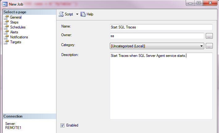 I run a single trace on a single instance in this walkthrough, just for illustration purposes, but this framework allows any number of instances and traces to be managed simply by adding a row to SqlInstance for each traced instance and a row to SqlTrace for each trace. The server named CENTRAL in this walkthrough serves as the central management server. The server named REMOTE1 is a traced instance. You can use a single server for both roles if you have only one test server.