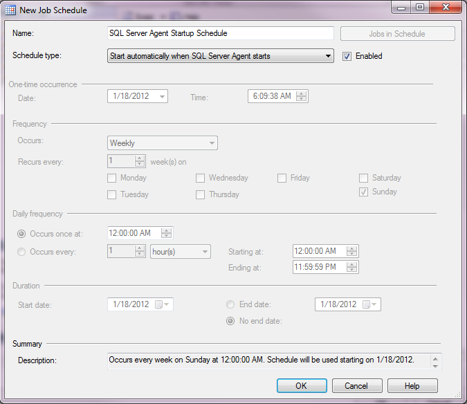 Because server-side traces do not persist across SQL Server service restarts, I verify that the SQL Agent service is configured to start automatically on each server and create a SQL Agent job on each to execute the trace create procedure whenever SQL Agent starts. The SQL Agent service is dependent on the SQL Server service so the trace will be recreated every time SQL Server is restarted. Figures 2, 3 and 4 show this job along with the T-SQL script step and schedule. Create the job as shown, customizing the T-SQL command in Figure 3 with your actual UNC trace file path, which is the same as specified in Listings 2 and 5. Be sure to specify DbAdmin as the database context in the Listing 3 T-SQL job step.