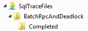 - Trace files for the BatchRpcAndDeadlock trace will be written to the folder of the same name. The SSIS package created in the next Level will move these files to the Completed subfolder, from where they are imported. For additional traces, create a folder named with your trace name under the trace root folder along with a Completed subdirectory.