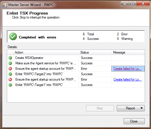 Click Next, and Finish, and you should see something like Figure 7 with the wizard completed, your default instance a master server, and your two additional instances as target servers. You may get errors, as shown in Figure 7, with the login creation. If that happens, you should ignore the errors as long as the enlist process works. The errors may simply mean that the service accounts are already provisioned.