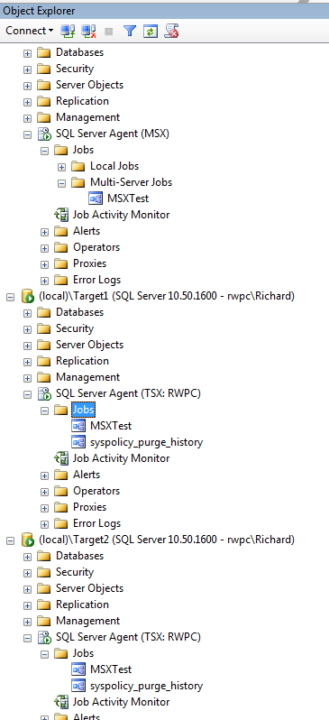 Wait at least one minute, for the replication of the job to the target servers to occur, and then refresh your SQL Server Agent Jobs nodes, and you’ll see something like Figure 10. Notice that on the master server, you now have a Multi-Server Jobs folder for the MSX jobs, and the jobs just show up as regular jobs on the target servers.
