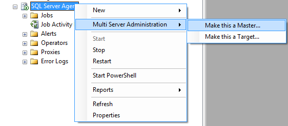 The easiest and recommended way to set up an MSX/TSX environment is to use the Master Server Wizard. Right-click on your SQL Server Agent node in SSMS, and select Multi Server Administration => Make this a Master… from the menu (as shown in Figure 1).