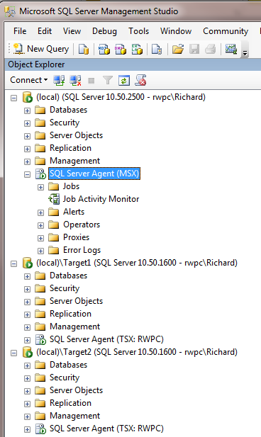 If you now refresh your SQL Server Agent nodes on your instances, you will note that SSMS shows the MSX/TSX roles for each node, as shown in Figure 8.